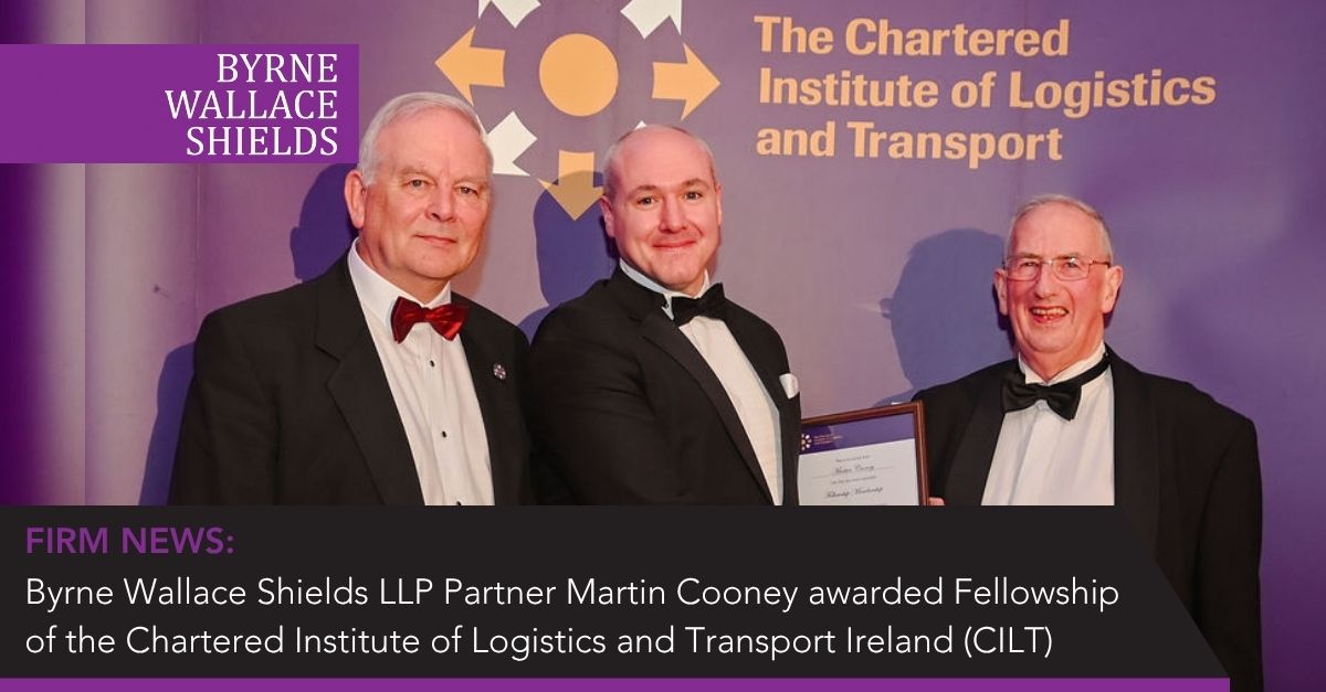 Byrne Wallace Shields LLP is delighted to announce that Partner and Head of Infrastructure, Construction and Energy Group, Martin Cooney was awarded the prestigious award of Fellowship of The Chartered Institute of Logistics and Transport Ireland (CILT) at the 73rd Annual Dinner hosted on Thursday, 16 October 2025 at the Royal Marine Hotel, Dún Laoghaire.