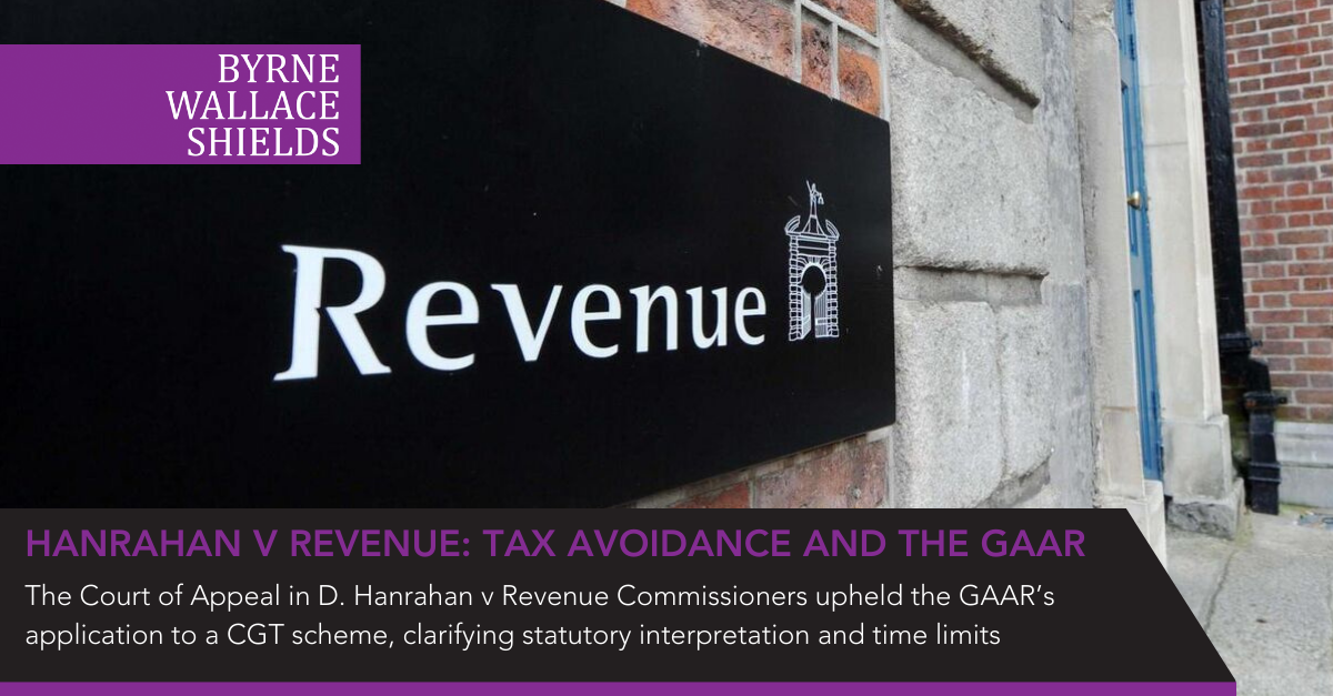 In Dermot Hanrahan v Revenue Commissioners [2024] IECA 113 the Court of Appeal considered the application of the general anti-avoidance rule (GAAR) in s811 of the Taxes Consolidation Act 1997 (TCA 1997) to a scheme related to capital gains tax (CGT). The Court of Appeal held that s811 applied to the scheme, reversing the judgment of the High Court and restoring the first-instance decision of the Tax Appeals Commission. Section 811 has now been replaced by s811C TCA 1997 in relation to transactions commenced after 23 October 2014, but the decision remains of relevance, given that s811C is closely modelled on its predecessor.