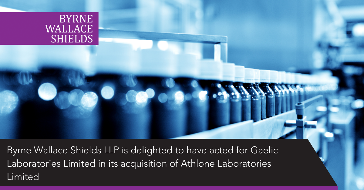 Byrne Wallace Shields LLP is delighted to have acted for Gaelic Laboratories Limited in its acquisition of Athlone Laboratories Limited, a leading manufacturer of Beta-Lactam products in Ireland. The Byrne Wallace Shields team was led by Jennifer McGuire, Partner and Head of M&A and Lisa McEllin, Of Counsel, with assistance from Michael Cunningham, Associate, and other members of the team across various practice areas.