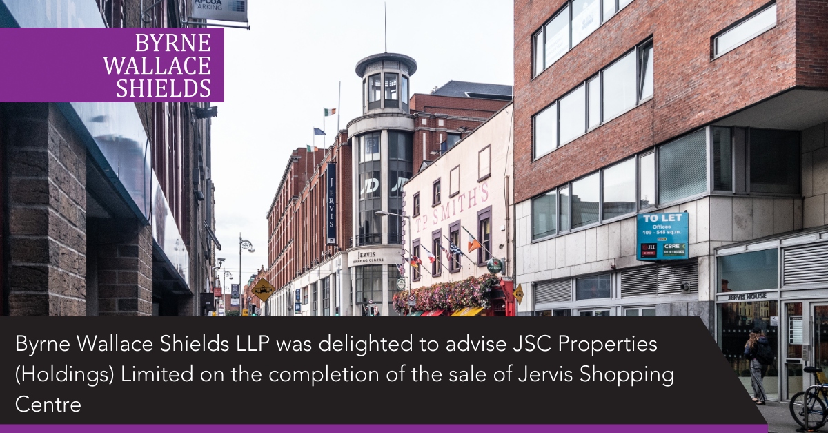 Byrne Wallace Shields LLP was delighted to advise JSC Properties (Holdings) Limited on the completion of the sale of Jervis Shopping Centre. Anchored by several international brands and comprising over 70 retailers, this significant transaction was delivered by a collaborative team in JSC Properties (Holdings) Limited, Eastdil Secured and Savills.