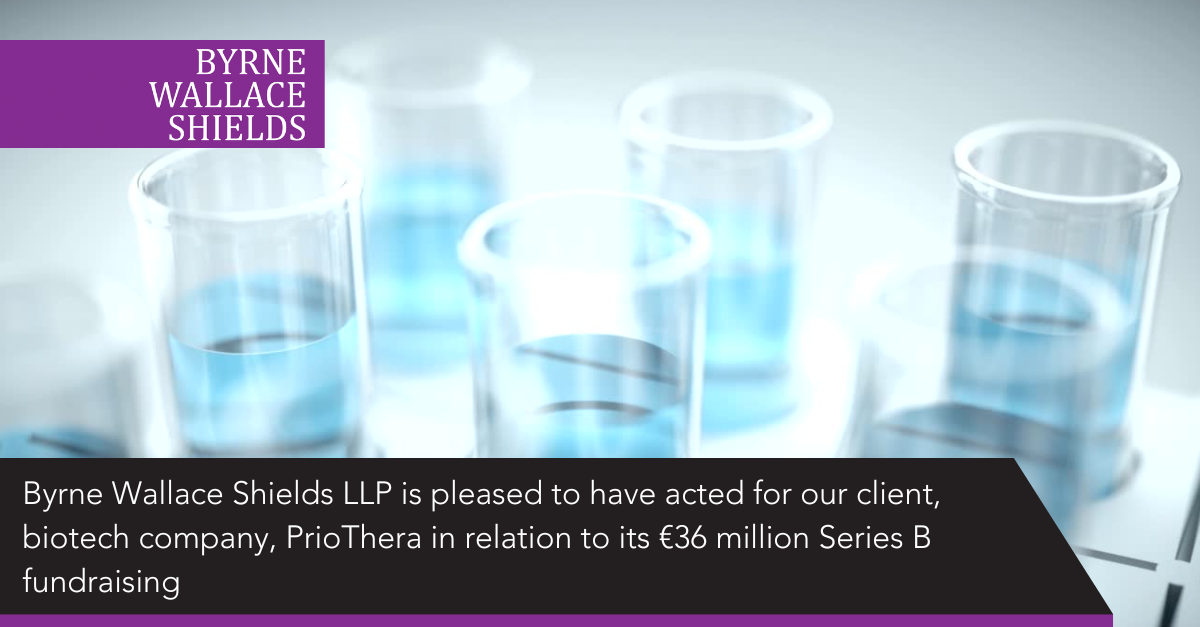 Byrne Wallace Shields LLP is pleased to have acted for our client, biotech company, PrioThera in relation to its €36 million Series B fundraising to advance the development of mocravimod, a drug taken orally that activates cell receptors to trigger part of the body’s immune response against myeloid leukaemia.